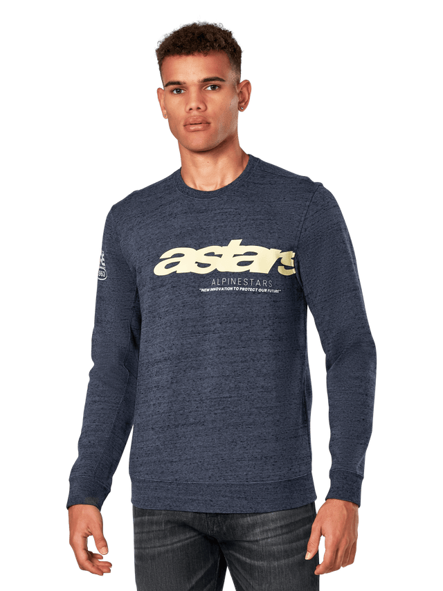 • Garment overdye on heather fleece. Engineer prints chest and back. Sleeeve print