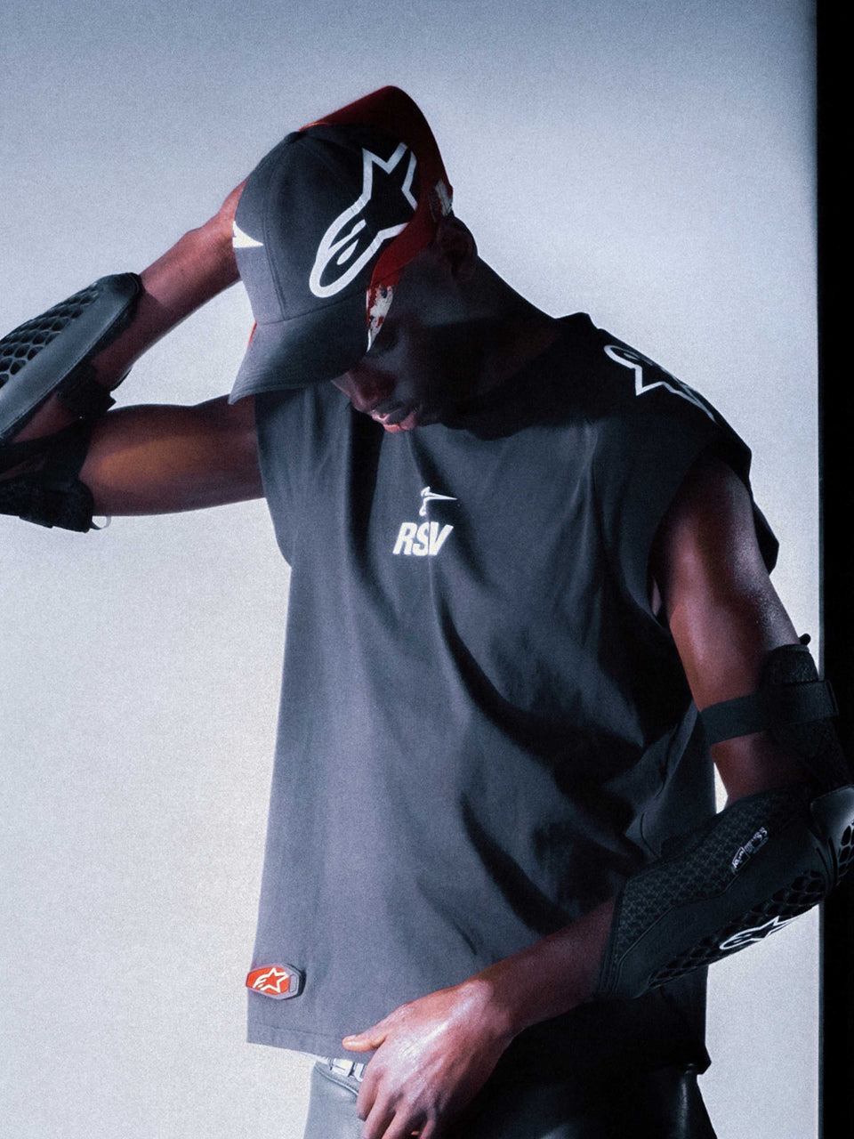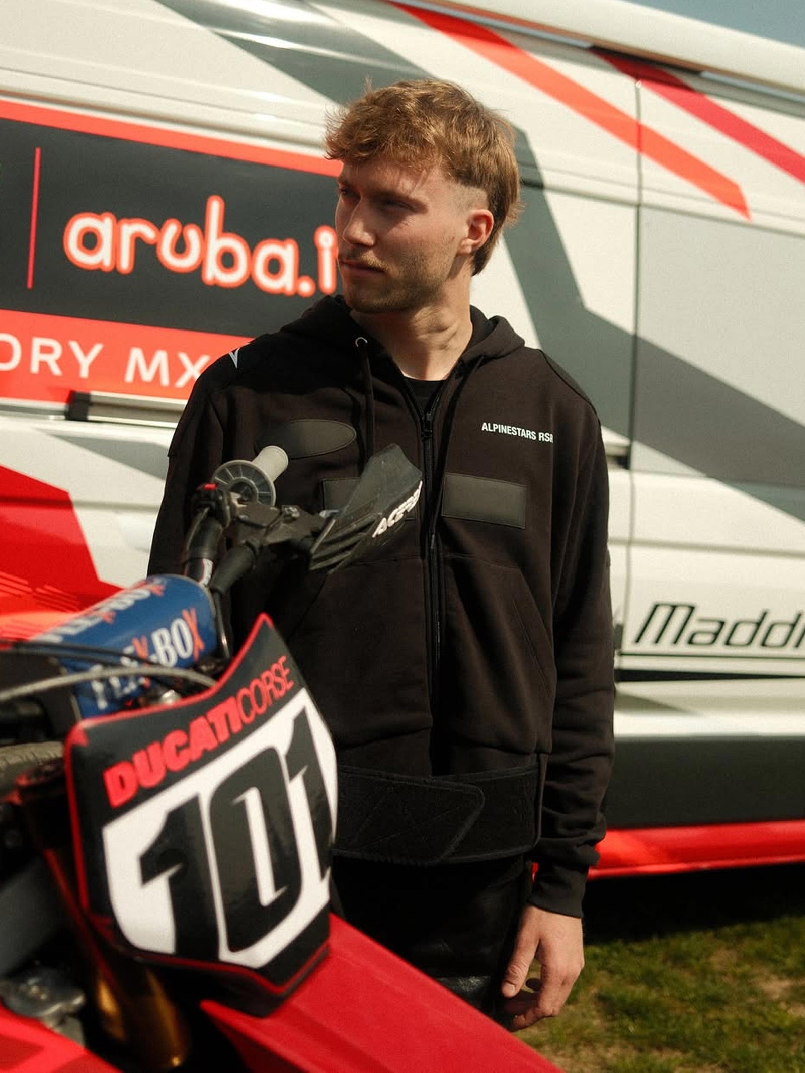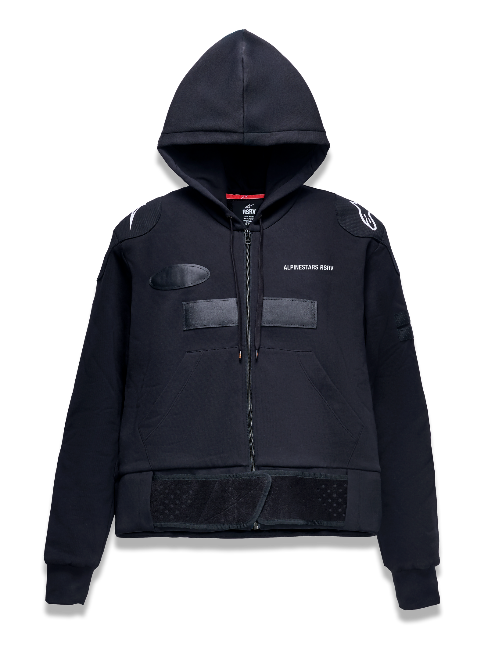 Foam-reinforced elbows and shoulders are a nod to Alpinestars’ traditional motorcycle jacket construction and the blank, padded leather patches add commentary on an athlete's persistent pursuit of sponsorship and support. Volume is elevated throughout the hoodie, using darts and foam reinforcement for a more structured look.