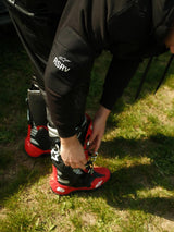 Another perfectly clipped apex of form and function, the BRACED HOODIE further investigates the aesthetics of recovery and resilience. Borrowing an elastic waist belt from one of Alpinestars’ protective Bionic MX jackets, this semi-cropped, heavyweight hooded sweatshirt is both subdued and distinct. The wide belt is integrated into the waist of the hoodie and the adjustable velcro closure allows for transformation from boxier to a more fitted fit. The belt also references the slings, braces, and other injury-related medical paraphernalia that an athlete might rely on for recovery.